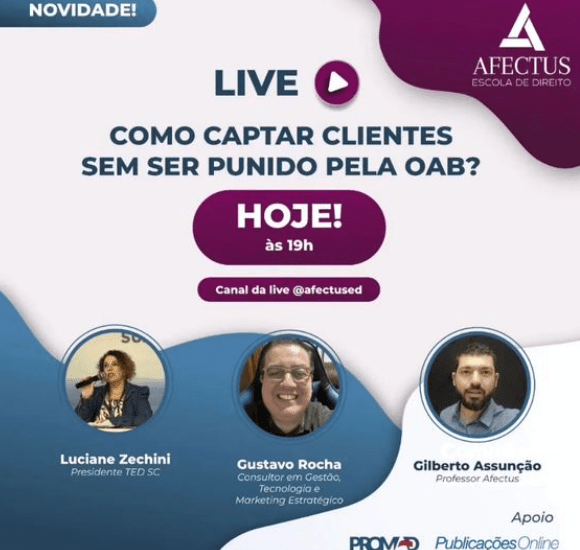 Nesta live promovida pela escola Afectus, Gustavo Rocha – consultor em gestão, tecnologia e marketing e Luciane Zechini – presidente do Tribunal de Ética de Santa Catarina debatem limites, estratégias e possibilidades de captação de clientes dentro do que a OAB permite.